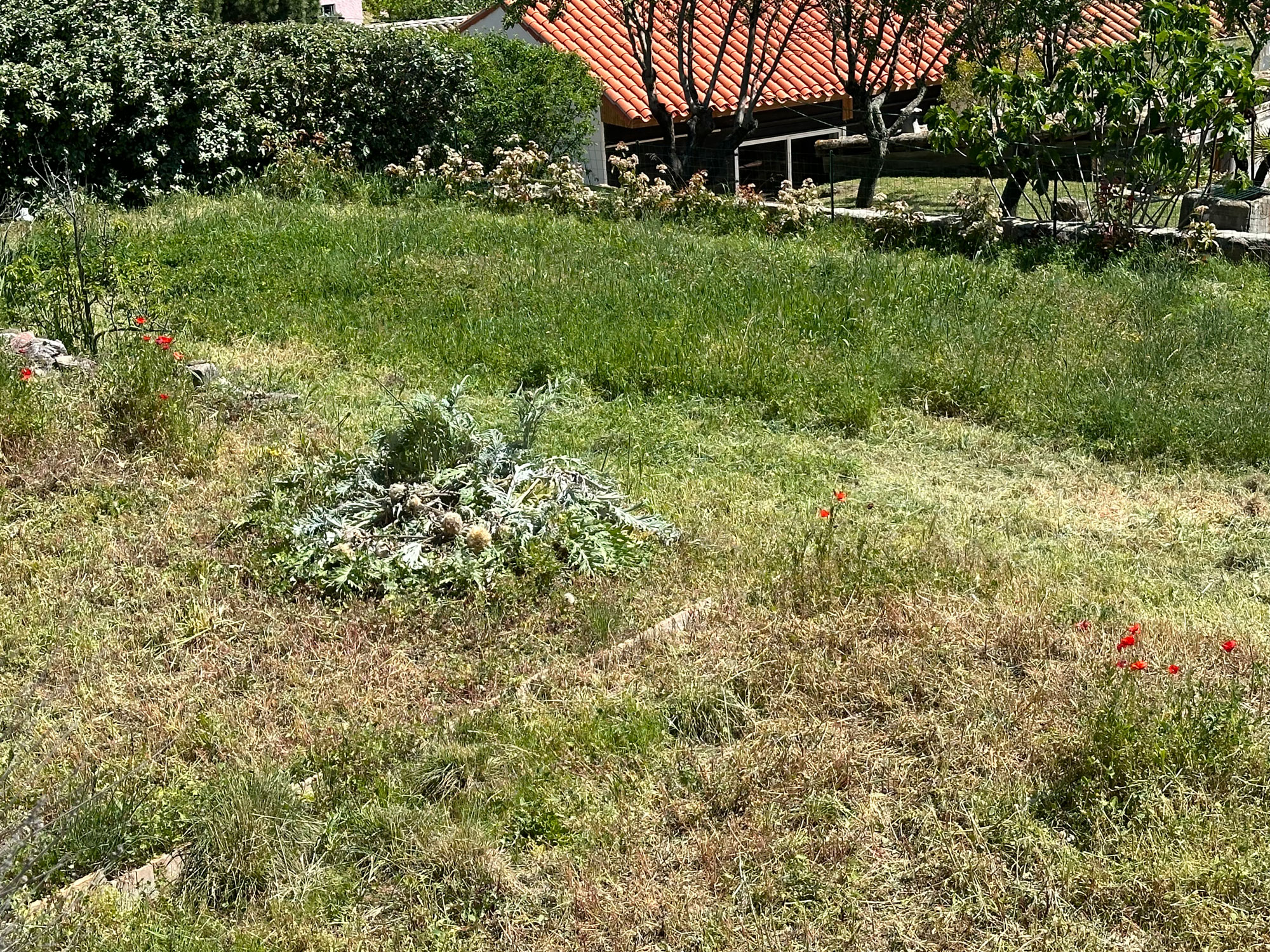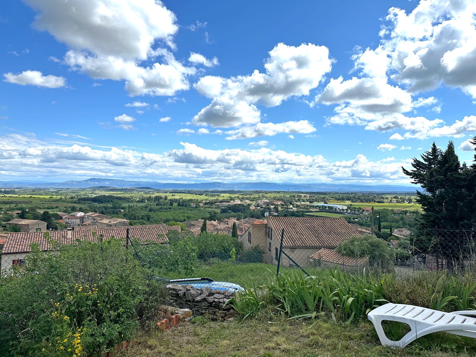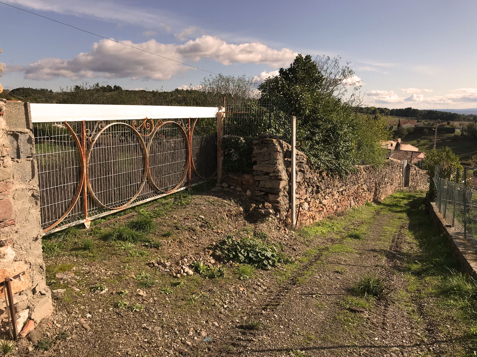 Magnifique terrain constructible offrant une vue imprenable sur les hauteurs de Caunes-Minervois, avec une cabane en pierre dessus.